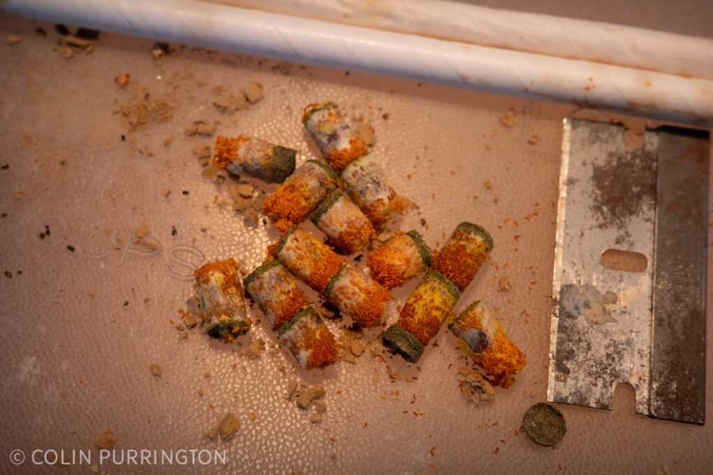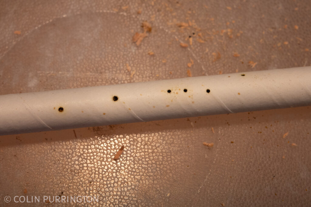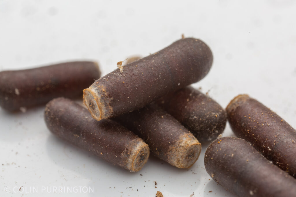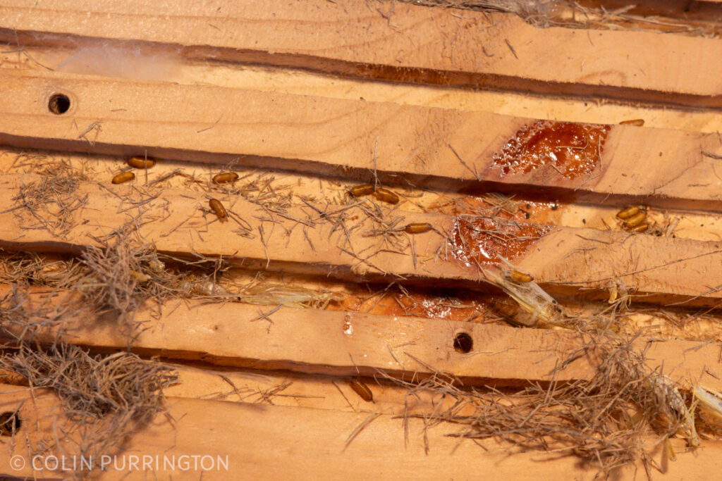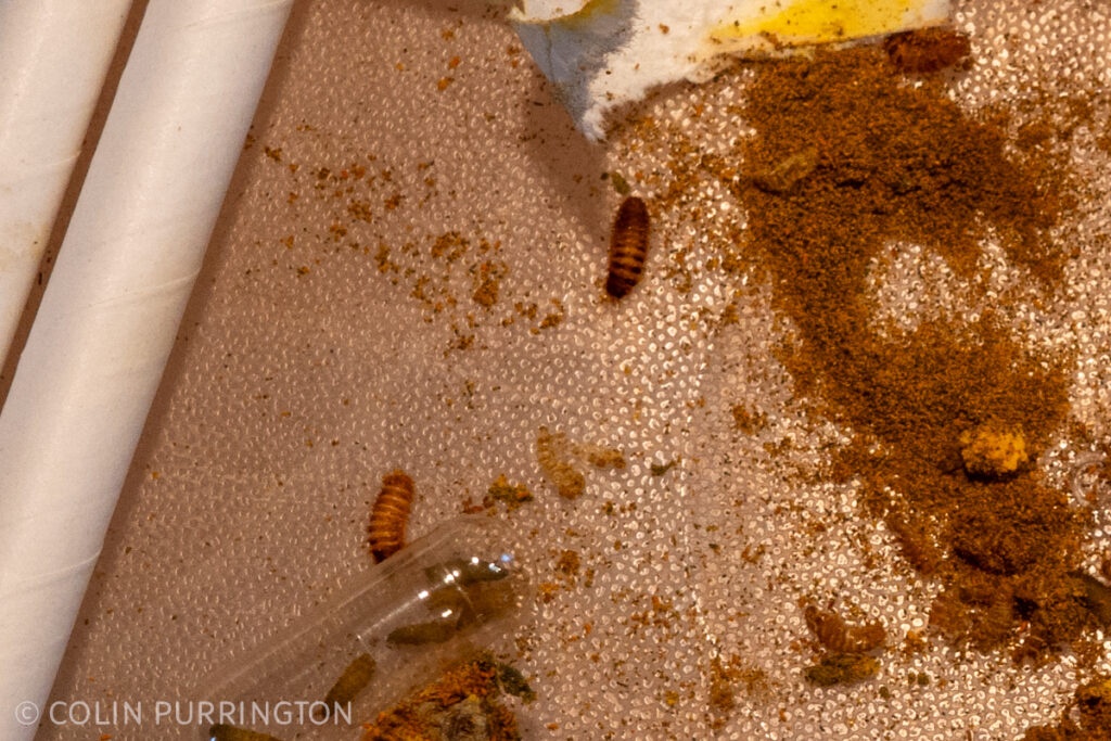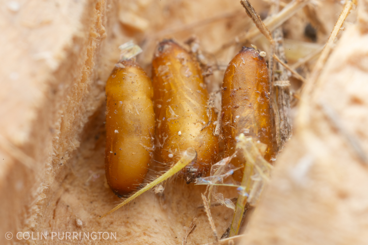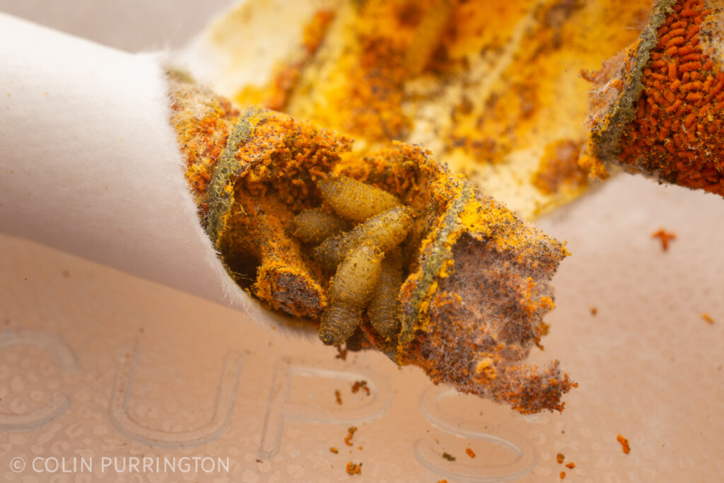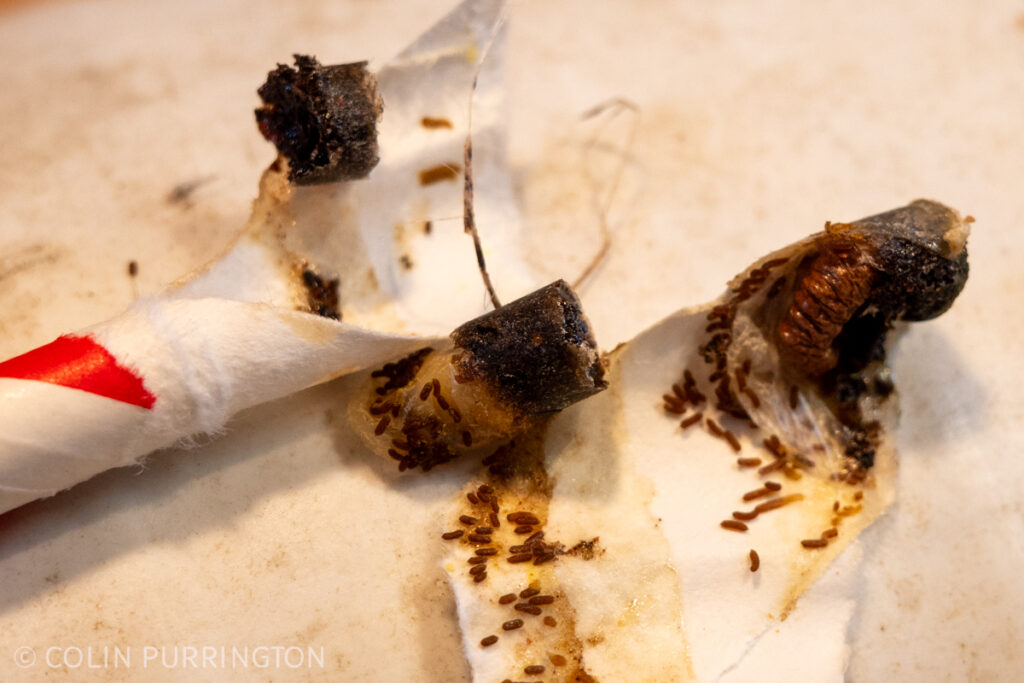 I also got a few grass-carrying wasp pupae but I forgot to take any closeups (here’s one from past). For some reason the females prefer to nest in observational panel. The tunnels are full of grass and dead crickets but the larvae are there.