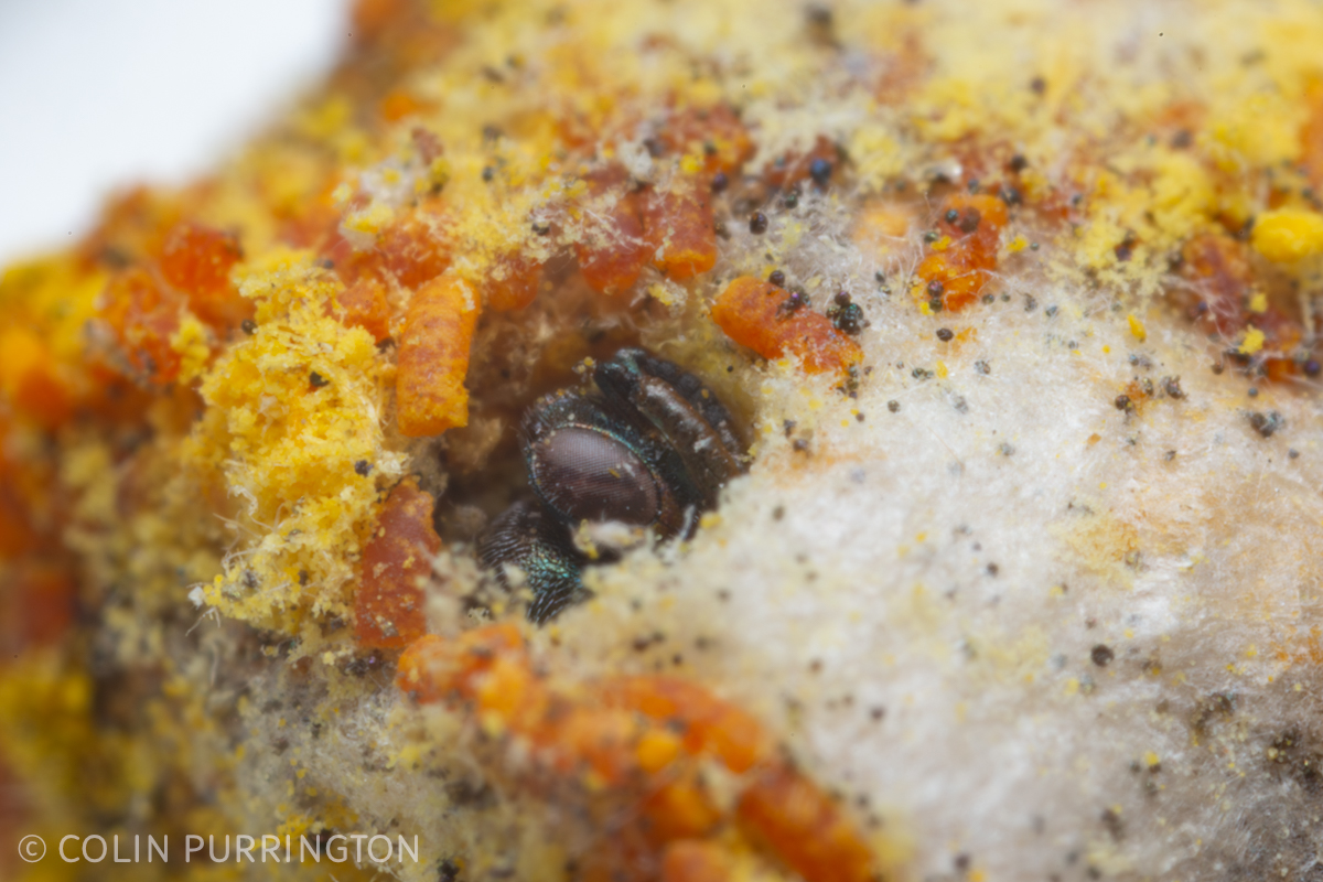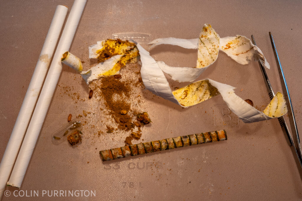 As always, some of the mason bee cells were filled with adult, dead Monodontomerus sp., a parasitoid. I can easily tell they are inside because they have partially chewed exit holes through the straw. When you unwrap the straw the adults are still inside the bee cocoon, apparently unable to exit because the straw is wedged into the drilled hole tightly. In the real world the wasps would chew through the stem and be able to escape. I have pics of larvae, trapped adults, and a female).