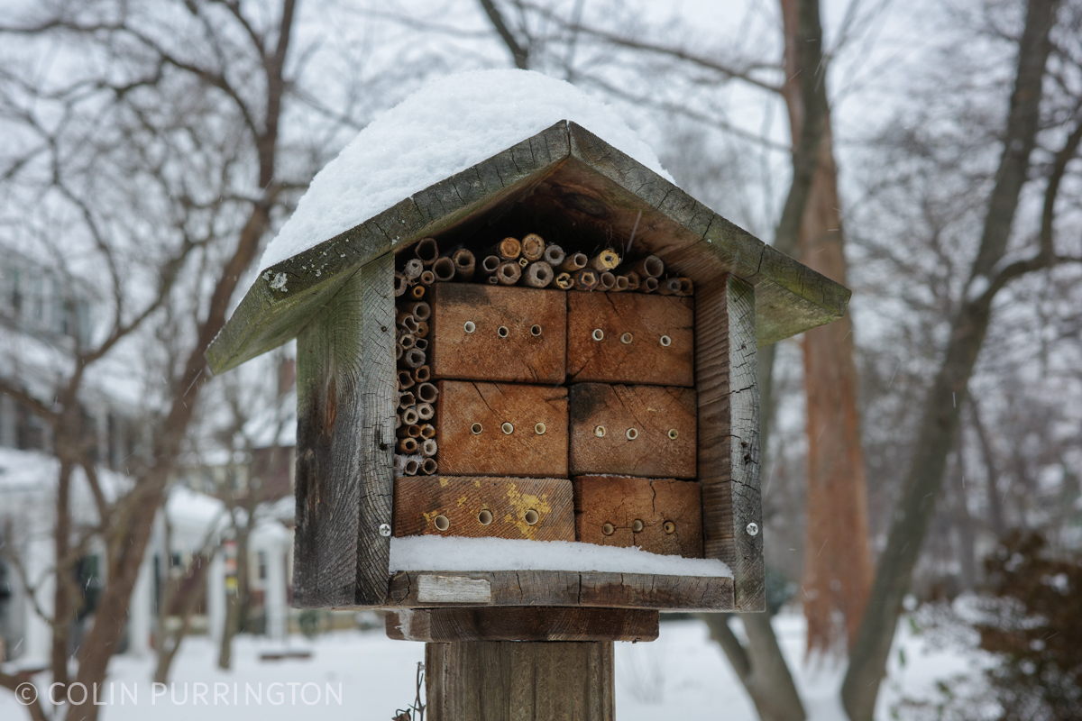 The cold and snow this winter have prevented me from taking many nature photographs, so it was a treat to have a look inside my two insect hotels. The one below is in the front yard. As you can see, it has a mix of hollow stems and wood blocks that have holes lined with paper straws. I split open the stems and unravel the straws to see who is inside, a process that is interesting but also allows me to kill any non-native, invasive parasites I find. I.e., I don’t want my hotels to be a breeding facility for pests and pathogens that might spread out and harm populations of local bees and wasps.