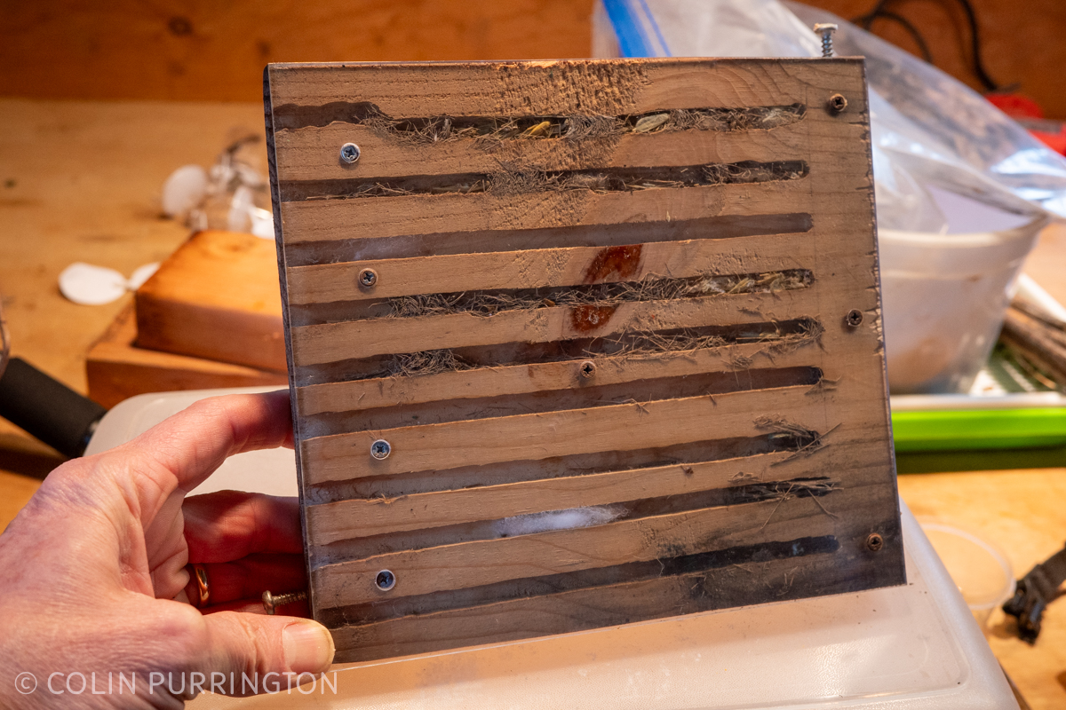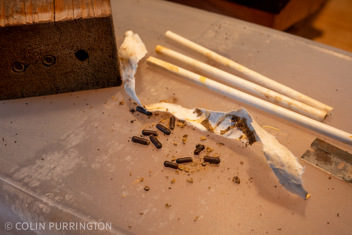 Several of the mason bee cells were infested with the kleptoparasitic, non-native Houdini flies (Cacoxenus indagator, adult). I usually kill them but this batch is bound for a researcher who needs them.