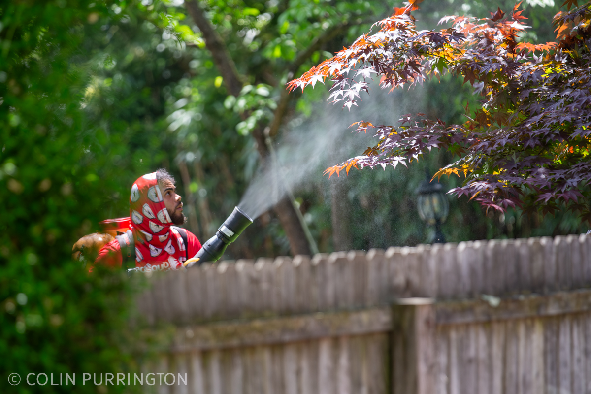Mosquito Shield guy spraying pyrethroids onto a tree near a fence.
