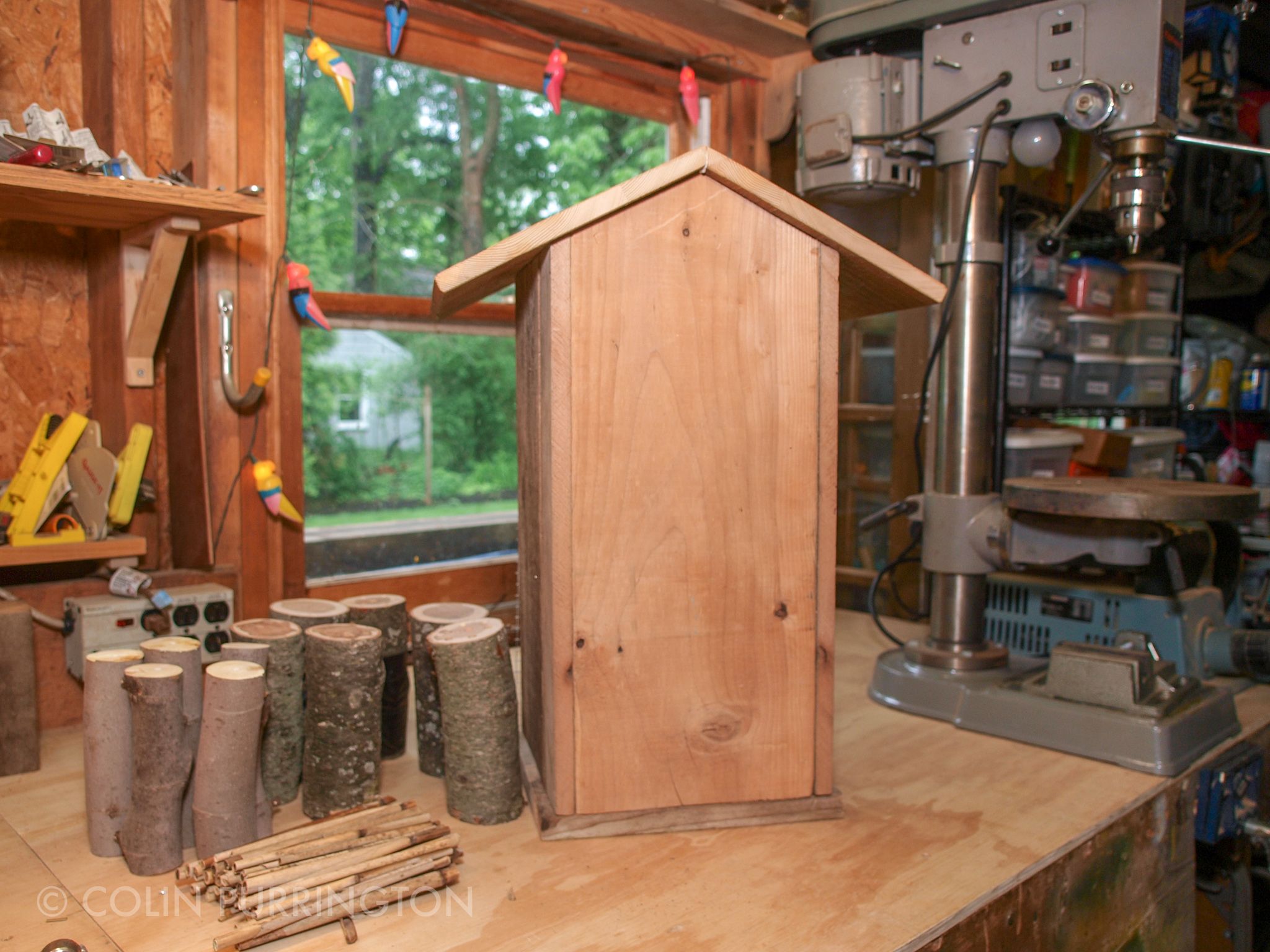 To keep everything dry on something this tall you need a generous roof overhang. Mine extends 5 inches beyond the front of the shelf, plus the wood sections and reeds are set back from that by another inch or so. If you have a shorter house you can have a smaller roof.