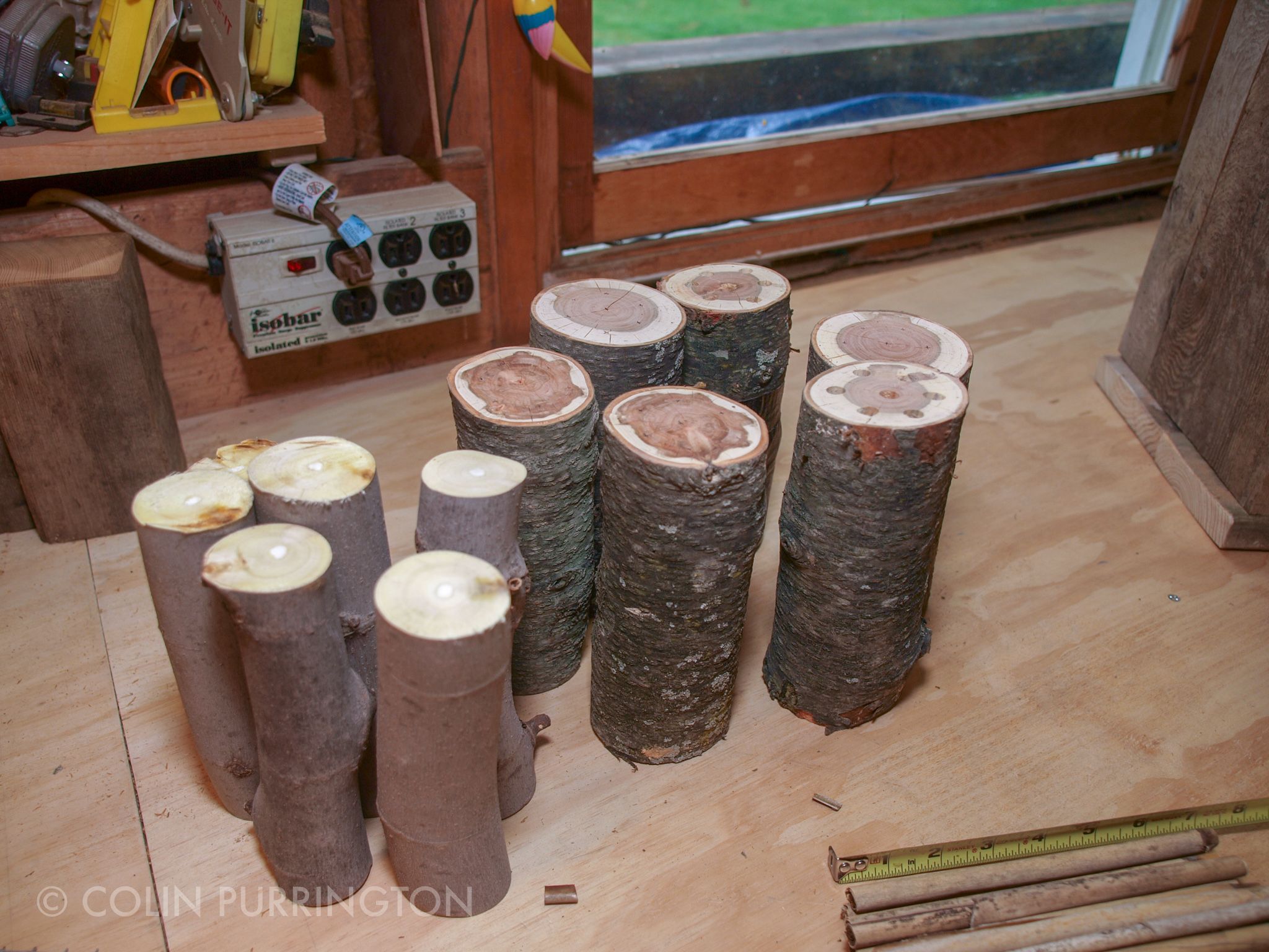 There are hundreds of different bee (Megachilidae) and wasp species that nest in holes, and all have slightly different preferences for wood type, hole diameter, and depth, so I’ve offered them a variety of accommodations in reeds, logs, and milled lumber, all cut into 7-inch lengths. The reeds are from Phragmites, and each section is cut so that the end has a node, leaving approximately 6 1/2 inches of usable tube. Logs and blocks are drilled with variable sizes of bits. The large log on bottom right also has a mix of 7/16-in and 1/8-in holes, some of which are already filled up (with mixture of nectar, mud, pebbles). Directly above the large log are two smaller ones that show how you can insert 6-in paper tubes into holes. At the end of the season you can easy pull those tubes out and transfer them to a protected location or refrigerator to overwinter. The other advantage of these disposable paper tubes is that you can easily unwind them to collect, study, and clean the pupae. The other paper tube is just a drinking straw I found on Amazon. These tubes will probably not be used this summer but I have them there just in case (the tubes are used by Spring mason bees and my house went up a bit too late this spring to attract any, I think). Finally, I have a few large-bore holes up in the attic space just in case that might appeal to a larger bee or wasp, though I probably won’t get a taker.