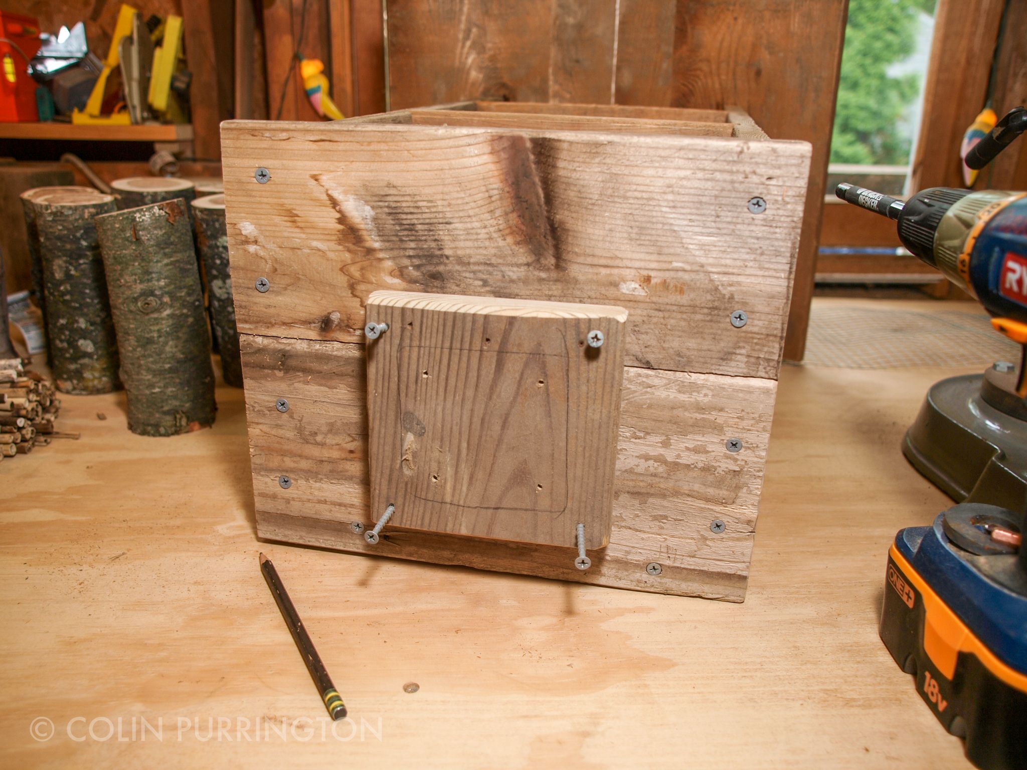 I also have a piece of galvanized hardware cloth that can be attached (pic below), after all the holes are filled, to keep woodpeckers away. The wire is held by six neodymium magnets glued into small insets on each side. I’ll probably redo it with larger-hole chicken wire, and make it project farther away from the surface. The back of the hotel is a slab of 2×10. To attach the hotel to a post I used a small piece of wood that is first attached to the post, then attached to bottom of the house via four screws (shown below). Everything is just scrap wood from some dismantled cedar planters. Below are some pics: