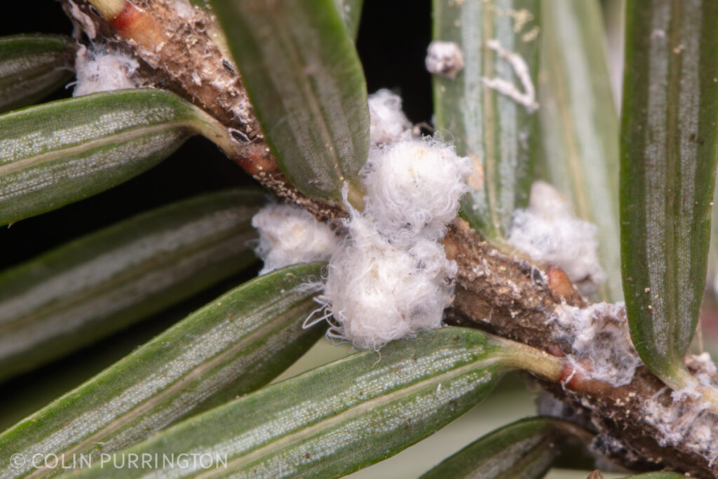 As in many parts of North America the eastern hemlocks at Lake Mohonk are getting hammered by the invasive hemlock wooly adelgid (Adelges tsugae). There were no signs of the beetles (three different species) and silver flies (two Leucotaraxis spp.) that are known to attack them.