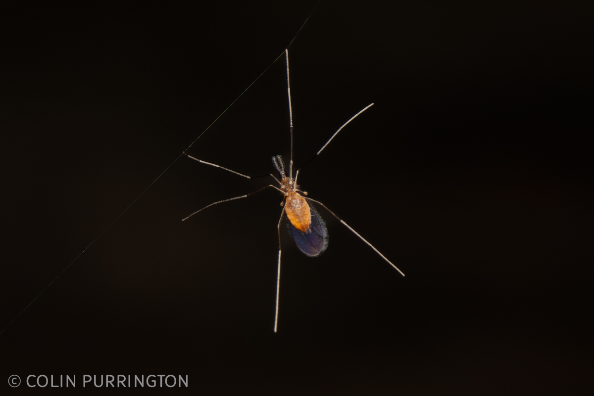 This was so small I assumed it was a spider with just six legs. Eventually figured out it was a gall fly (Cecidomyiidae) when I loaded the photographs onto my computer. It was hanging on spider silk, a behavior that is apparently quite common in the family.