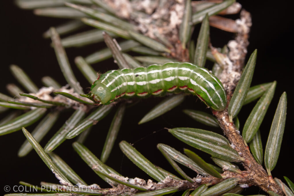 This is a larva of Feralia jocosa (Noctuidae), which apparently goes by the common names “the joker” and “jocose sallow.” It’s munching on eastern hemlock (Tsuga canadensis). Adults are gorgeous but I’m not sure what is so funny about them. Probably an inside joke.