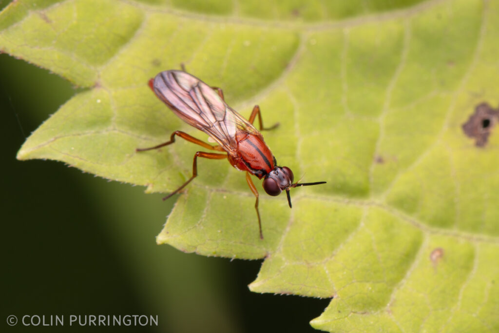 This is Loxocera cylindrica (Psilidae). They puncture and hoover up fluids from leaves, resulting in patches of brown discoloration that give the family its common name (rust flies). Larvae mature inside stems of inland sedge (Carex interior), which tend to grow around calcareous swamps and marshes.