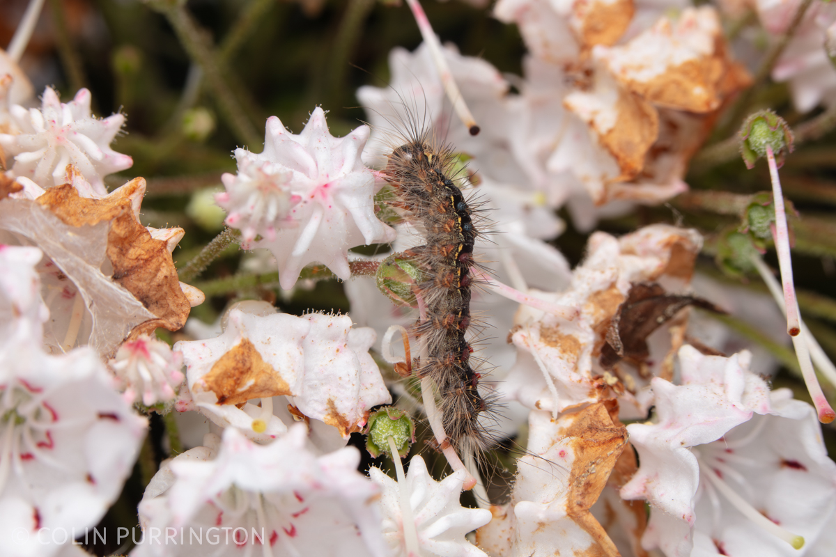 The spongy moths (Lymantria dispar) were everywhere this year and seem happy eating everything, even toxic mountain laurel (Kalmia latifolia) that deer won’t touch.