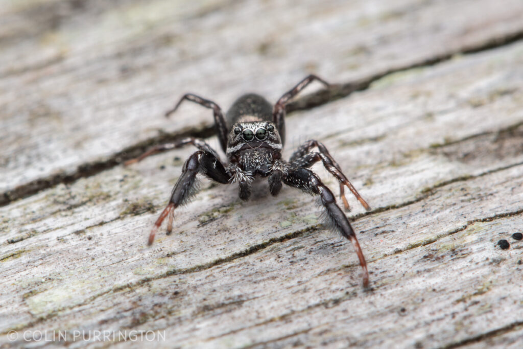 This is a Hart’s jumping spider (Tutelina harti) that was thinking about leaping onto my camera. I’ve always wondered whether spiders see the lens and assume it’s an eye. I love the white stripe below the eyes.